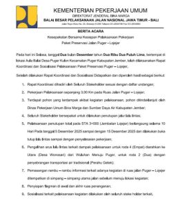 Jember,nusabarong.com – Kementrian PU BM Balai Besar Jalan Nasional Jawa Timur – Bali melakukan rapat kordinasi dan sosialisasi pelaksanaan paket preservasi Jalan Puger – Lojejer bertempat di aula balai desa Puger Kulon kecamatan Puger kabupaten Jember.Pada Senin (2/12/2025).